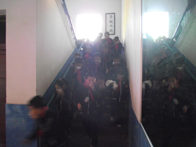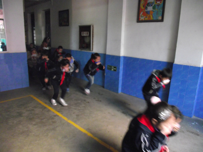 伴随着广播中传出“教学楼内发生火灾,请各位老师组织学生撤离”的指令,附小2011年火灾应急疏散演练开始了。同学们在老师的带领下,用手绢、毛巾等捂住口鼻,弯着腰,迅速、有序地撤离教室,跑向操场。从发出信号开始撤离到操场集合完毕仅用了1分零48秒。