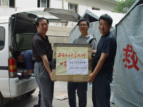 灾区的情况时刻牵动着西安工大广大师生的心,当获知灾区急需口罩等救援物资后,学校党政领导非常重视,指示有关单位速购口罩支援灾区。国资处同志迅速筹措到5450只口罩,于5月20日上午由校工会和国资处人员将其送交陕西省红十字会,红十字会承诺尽快将这些口罩转送到灾区。