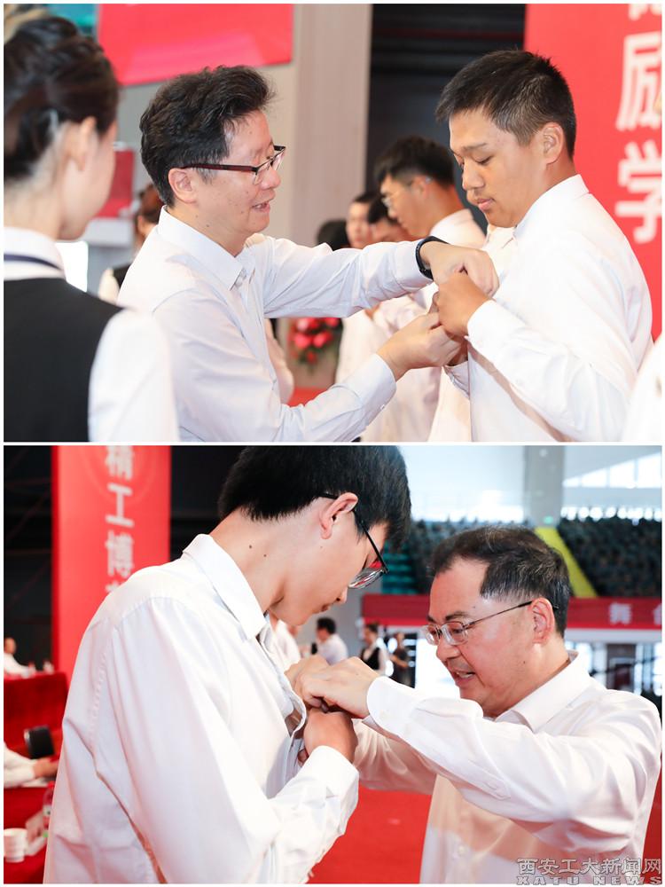 校领导为新生代表佩戴校徽。
