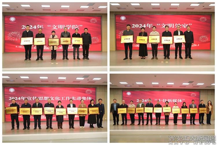 校领导分别为获得2024年“文明学院”“文明处室”、宣传思想文化工作先进集体、“十佳新媒体”和校园文化建设优秀成果奖的代表颁奖。