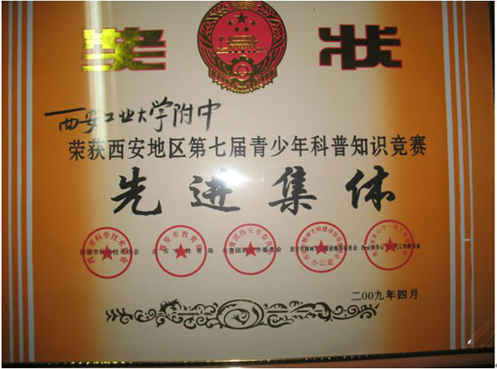 (本网讯)在近日举办的2009年西安地区第七届青少年科普知识竞赛中,九游官网附中高二(4)班辛静等12名同学分获一、二、三等奖,附中被评为“先进组织单位”,陶红同志被评为“先进组织个人”。