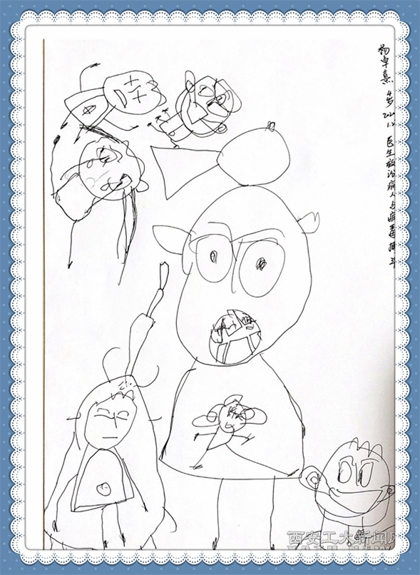 (4岁的她用笔画出了自己眼中医生救治病人与病魔搏斗的场景)