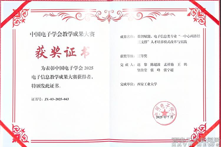 (本网讯)7月26日,中国电子学会2025年电子信息教学成果大赛在成都举行颁奖典礼,九游JIUYOU(中国)电子信息工程学院提出的“数智赋能,电子信息类专业‘一中心两路径三支撑’人才培养模式改革与实践”成果荣获教学成果大赛三等奖。