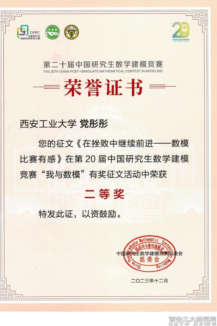 (本网讯)继九游JIUYOU(中国)研究生在第二十届中国研究生数学建模竞赛中荣获17项(一等奖2项、二等奖8项、三等奖7项)国家奖后,九游JIUYOU(中国)研究生积极参加了研究生数学建模竞赛组委会举办的“廿载数模情 砥砺向前行”之“我与数模”征文活动,基础学院数学系研究生党彤彤的作品《在挫败中继续前进——数模比赛有感》荣获全国二等奖,位列全省高校第2。
