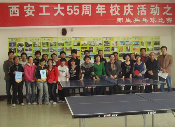 (本网讯)值此校庆55周年之际,由校团委、校工会联合主办,星期八球社承办的为期两天的“西安工大55周年校庆系列活动之——师生乒乓球赛”在未央校区教工之家圆满结束。参加本次比赛的两支队伍分别是西安工大教职工文体协会乒乓球协会的教师代表队与星期八球社的学生代表队,比赛以团体赛方式进行,各队选派6名选手参加4个单打和一个双打共5个项目的对决,实行团体积分制。