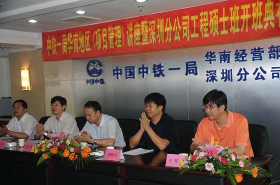 开学典礼由校长助理陈桦主持。党委书记赛云秀、副校长刘卫国以及中铁一局领导分别作了发言。赛书记在致词中说:学校与中铁一局深圳分公司的合作,符合学校面向社会、服务企业、校企联合的办学思想。希望同学们刻苦努力,学有所长,学有所用。随后,副校长刘卫国对办好广州工程硕士班提出了具体要求。
