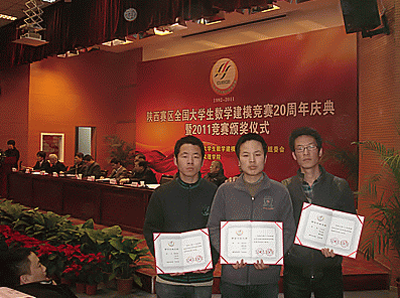 全国二等奖:参赛队员:胡浩强、王东兴、李远东;指导教师:冯孝周。陕西赛区一等奖:参赛队员:刘丹、屈栋、王迪; 指导教师:王文海。陕西赛区二等奖:参赛队员:岳鑫、李金龙、赵涛;指导教师:袁庆生。参赛队员:吴永勃、马星星、孙红英;指导教师:薛鹏翔。参赛队员:李瑞文、赵淋伟、梁少雄;指导教师:马元魁。参赛队员:王冬、薛辉、聂瑞;指导教师:马元魁。参赛队员:王育飞、罗苏毅、曹文俊;指导教师:李花妮。陕西赛区优秀指导教师:薛鹏翔。