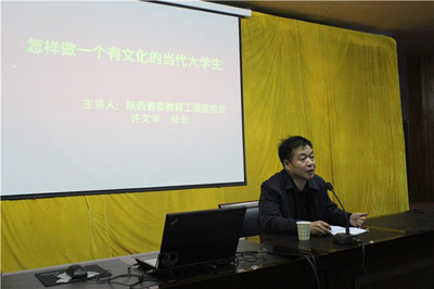报告会上,许文学处长分别从(一)、树立文明意识,注重身边点滴;(二)、树立诚信意识,以诚待人,与人为善;(三)、树立责任意识,增强社会责任感;(四)、树立协作意识,让团结实现自我价值;(五)、树立自信意识,笑对人生等五个方面进行阐述。报告中用陕西高校大学生身边的真实事例、质朴的语言引导同学们如何成为一个有文化的大学生。同时,许处长运用贴近大学生成长的语言,列举了大学生学习生活中的大量实例,引述古今中外的经典典故,告诫广大学员只有努力学习,树立奋斗目标,静心研读,系统思考,不断提升自身素养,才能充实自我,丰富阅历,实现自我价值。