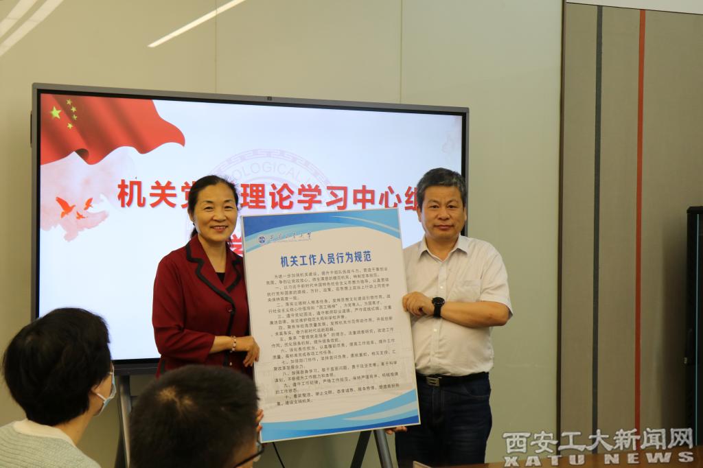 4月24日,校党委副书记王军周在机关党委中心组学习会上向各党支部颁发了《规范》。《规范》重点围绕“讲政治、担使命、守规矩、聚主业、改作风、提质量、强协作、重学习、守纪律、讲文明”等十个方面对机关工作人员行为作出要求。