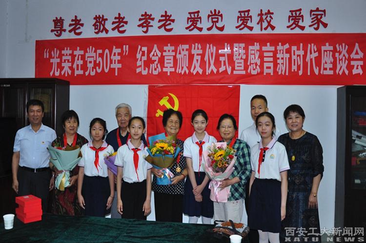 颁发仪式上,刘发林为“光荣在党50年”纪念章获得者代表一一颁发纪念章,活泼可爱的附小小朋友们为老党员献花并合影留念。