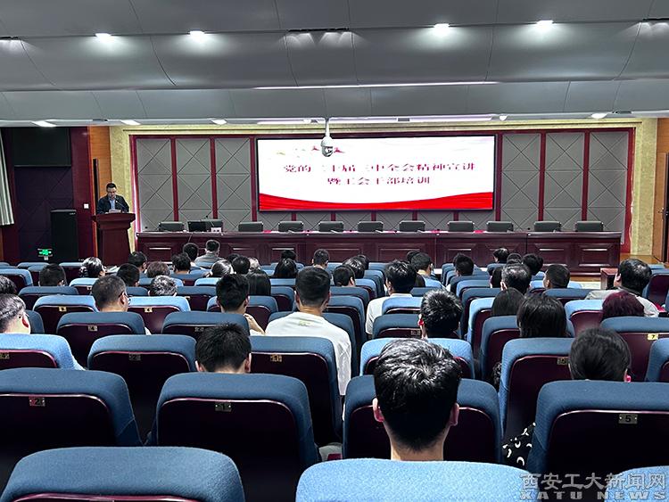 (本网讯)为深入学习贯彻党的二十届三中全会精神和习近平总书记关于工人阶级和工会工作的重要论述,持续增强工会干部的服务能力和水平。10月16日,校工会在未央校区举办了党的二十届三中全会精神宣讲暨工会干部培训。陕九游官网运学院副院长乔昕教授受邀做专题报告,党委副书记梁云鹤出席、全校工会专兼职干部及基层党委(党总支)书记100余人参加。会议由校工会主席朱峰主持。