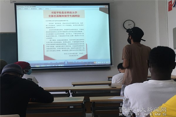 计算机学院巴基斯坦籍留学生穆沙表示:“习近平总书记的回信令我们感到非常鼓舞,同时,感谢西安工大疫情期间给我们发放口罩、体温计、蔬菜等亲切关怀。希望携手世界青年掌握专业知识,共同进步,从自身做起,为社会贡献一份力量。”经济管理学院科特迪瓦籍留学生三星表示:“疫情期间,自己有幸通过汉语录制视频短片为中国武汉加油,同时,把“中国经验”分享给自己的家人及朋友,感谢疫情期间中国政府及学校在防控制疫情方面所做的巨大努力。”