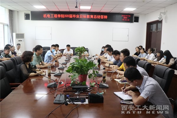 (本网讯)7月6日,机电工程学院举办2020届毕业生目标教育总结答辩会。院党委书记路金龙、党委副书记姚敏茹、专业教师代表及学院全体辅导员、班级目标教育答辩优秀学生代表参加了会议。