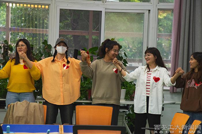 活动中,林老师带领所有体验者通过“相亲相爱一家人”手势舞、“滚雪球”自我介绍等破冰游戏迅速活跃现场气氛,拉进同学们的心理距离,在开放轻松、活泼愉快的情境中熟悉彼此,建立好感。