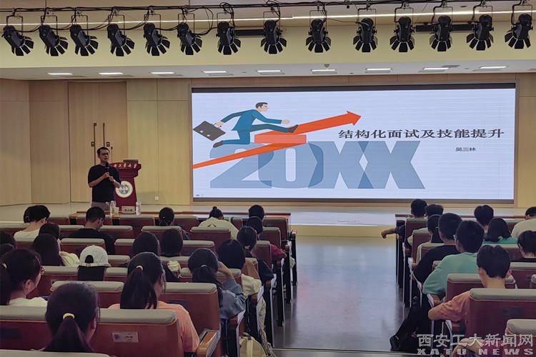 讲座现场座无虚席,气氛热烈。吴三林就面试中的专业需求、技巧要点、简历投递等方面进行了详细讲解,用对话的形式模拟了面试场景,让同学们更加直观地感受面试氛围。针对常见的面试问题,吴三林进行了深入分析和解答,讲授具体面试技巧。吴三林强调,同学们在介绍自己的优势时,不能只“摆出”优势点,需结合具体案例进行说明,这样能更加具体展示出能力素质。