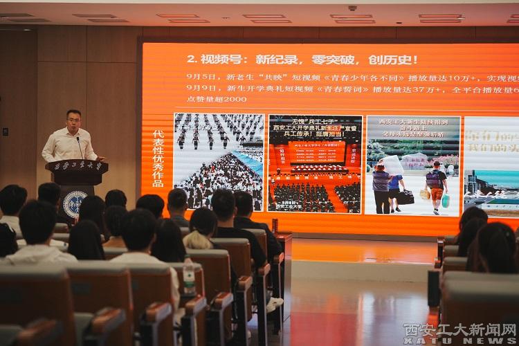 张鹏围绕“团队是什么”“团队做什么”“团队成效有哪些”三个方面,对2023-2024学年工作进行总结复盘。重申团队的多重身份,强调团队的关键词是“网络”,核心要义是“育人”,并从网络文字作品、网络视觉作品、线上线下精品活动、学生个人成长等四个方面作了详细汇报,并对团队优秀作品和品牌活动进行了图文并茂的展示。张鹏还列举了团队本学年的显性工作成绩,号召全体成员投入到团队发展和建设中来,创造更多荣耀。最后张鹏总结了九游JIUYOU(中国)第二届网络文化节的作品报送和获奖情况,并宣布第三届网络文化节开幕。