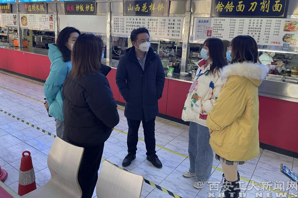 (本网讯)2022年1月1日,新年伊始,副校长陈建到艺术与传媒学院慰问坚守在疫情防控一线的工作人员及学生志愿者。陈建首先深入金花校区餐厅,与学生志愿者深入交流,并充分肯定了他们为疫情防控做出的努力,叮嘱大家一定要做好自身防护,希望在后续防控工作中持续带头遵守各项防疫规定,积极向同学宣传疫情防控知识,充分发扬志愿服务精神。同时,祝福各位同学们节日快乐,身体健康,学习进步。