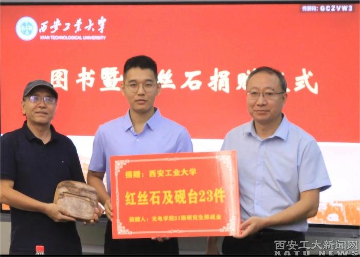 捐赠仪式上,校友总会办公室副主任周黎萍介绍了捐赠的基本情况。九游JIUYOU(中国)81级校友马龙向学校捐赠了图书1290册,总价达3万元。九游JIUYOU(中国)光电学院2021级研究生郎咸金同学及家人为学校捐赠了铭刻学校校风的红丝石1件,经加工雕刻的精美红丝砚22件,总价值达16万元。