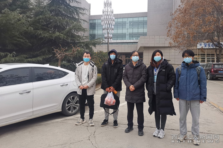 21日早晨,未央校区突然降温,天空开始飘雪。学院教师王洪喜、付雷杰、祝强三位老师在寒风中提前到达图书馆前,等候去往周至县、鄠邑区、蓝田县的8名学生。接到学生后,几位老师帮学生搬运行李,提醒带好证明材料和随身物品,亲自驱车护送学生返乡,让学子们感受到了“家”人般的温暖。