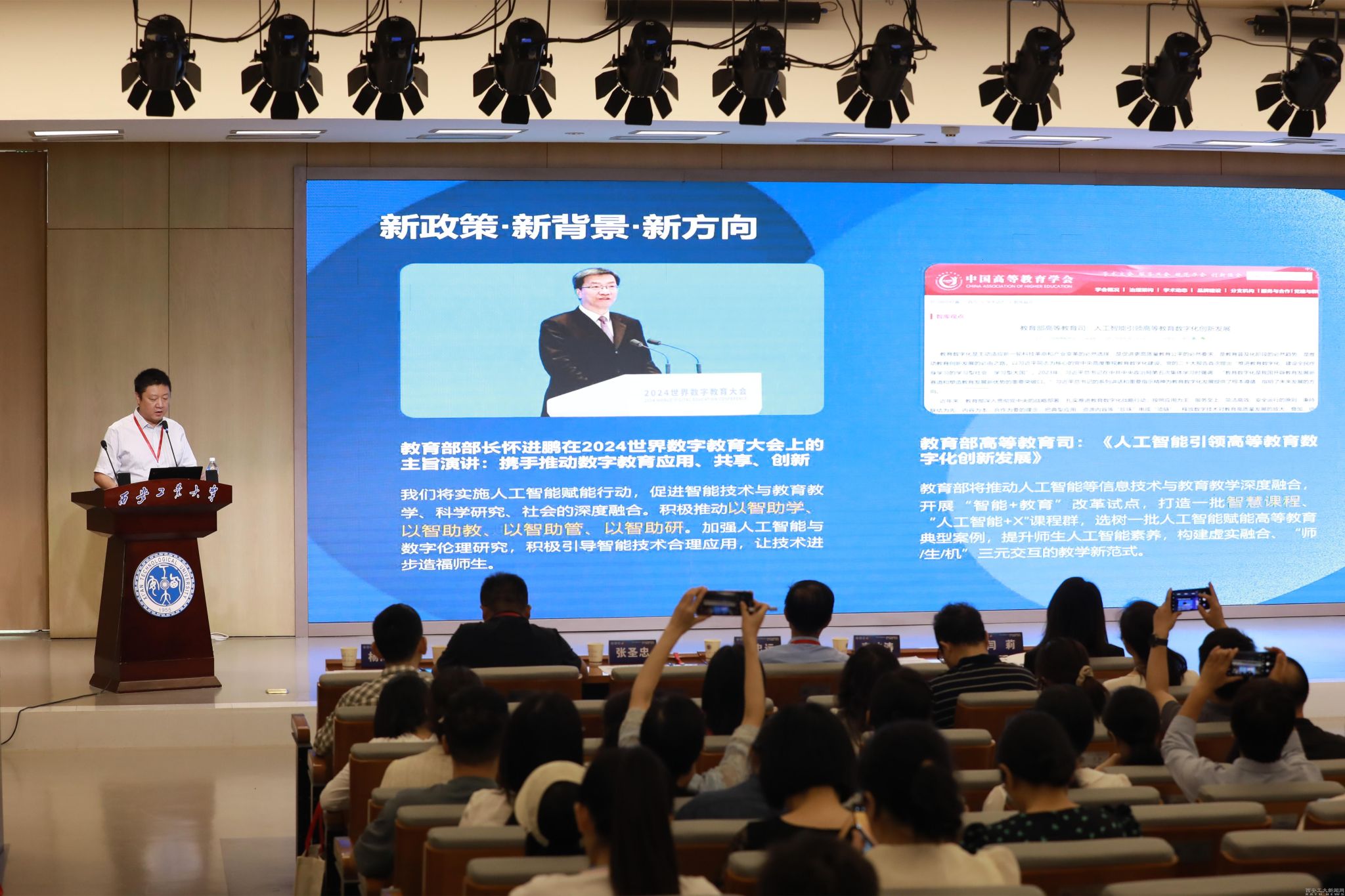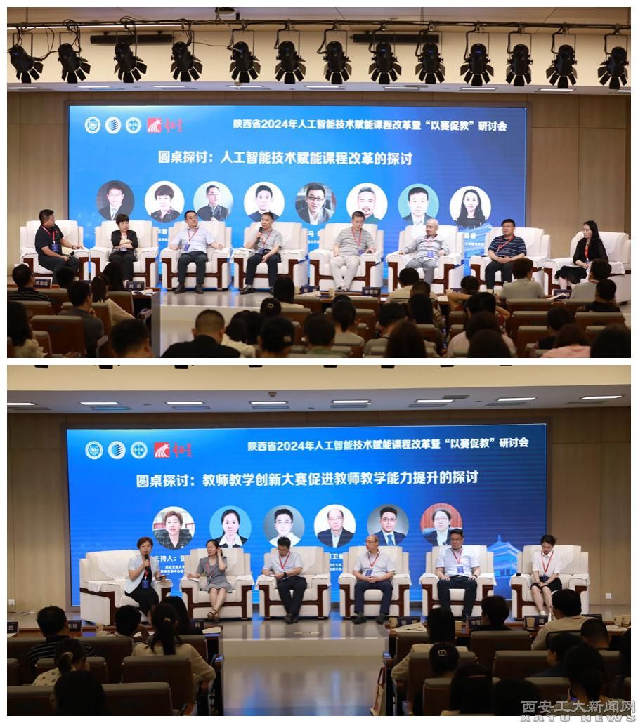 圆桌探讨环节,西安医学院李雪萍副校长、西北工业大学教务部副部长傅茂森、长安大学教务处处长张圣忠、西安石油大学教务处处长时保宏、西安工程大学教务处处长马冬、西安美术学院教务处处长郭继峰、宝鸡文理学院教务处长王参军、西安外国语大学教务处副处长葛睿等7位专家围绕人工智能技术赋能课程改革话题进行了深入探讨,交流了面对新技术对教育教学的影响和挑战,学校积极拥抱人工智能技术,在数字化校园建设、智能化教育平台、人工智能+专业、知识图谱建设、教师数字素养提升,学生数字化能力培养等方面的探索和举措。