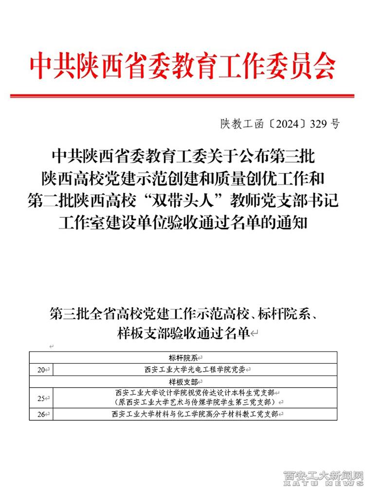 (本网讯)近日,省委教育工委公布了第三批陕西高校党建示范创建和质量创优工作验收结果,九游JIUYOU(中国)光电工程学院党委、材料与化工学院高分子材料教工党支部、设计学院视觉传达设计本科生党支部顺利通过验收。