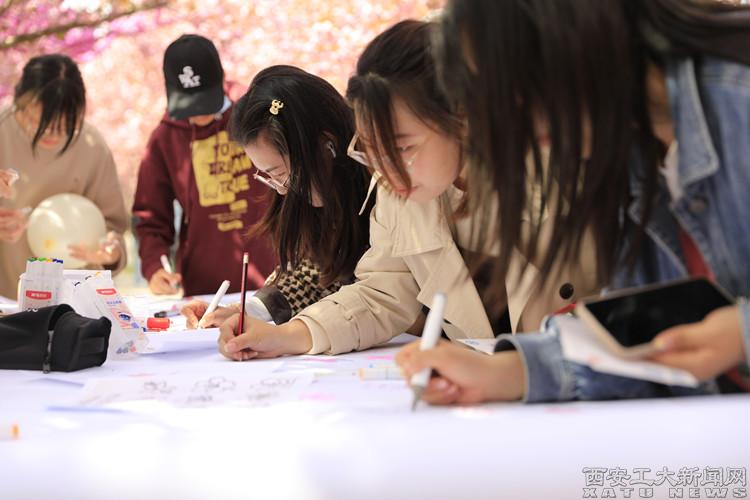 “琼心畅怀揽春景,笔墨丹青表诗意”。走进“识樱·对影”展位,落英缤纷的樱花树下,一群群朝气蓬勃的学生正结伴而行,赏花游乐,印章纪念。悠悠转入“荆桃·心诚,影底·阳春”展位,一条条祈福红绳都是对春日风光无限好的美好祝福、一张张春日限定美图都倾泻着作者心中最美的校园春景。