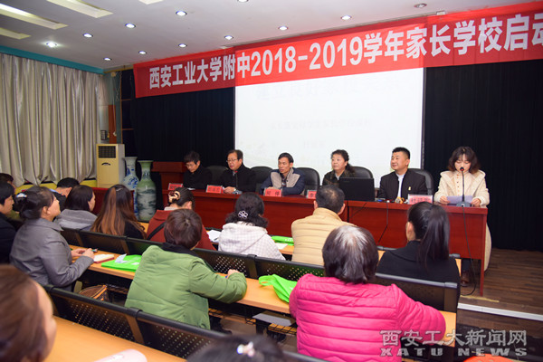 西安市关心下一代工作委员会办公室主任何停、碑林区关心下一代工作委员会常务副主任李瑛莲、西安市关心下一代家庭教育讲师杜延军、九游官网附中党支部书记胡诚忠、政教处领导以及初一全体家长参加了本次家长学校启动仪式。