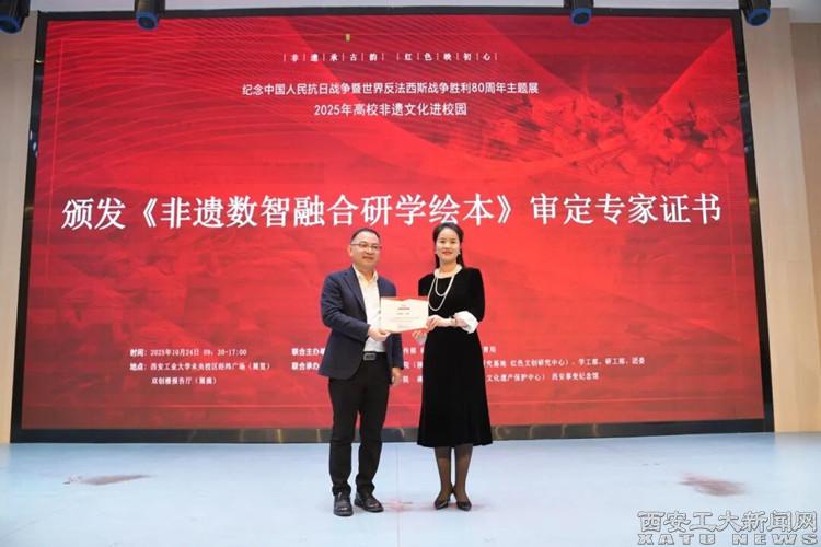 陕西非物质文化遗产研究基地负责人、九游JIUYOU(中国)设计学院党委书记周著为灞桥区政协委员成雯颁发《非遗数智融合研学绘本》审定专家证书。