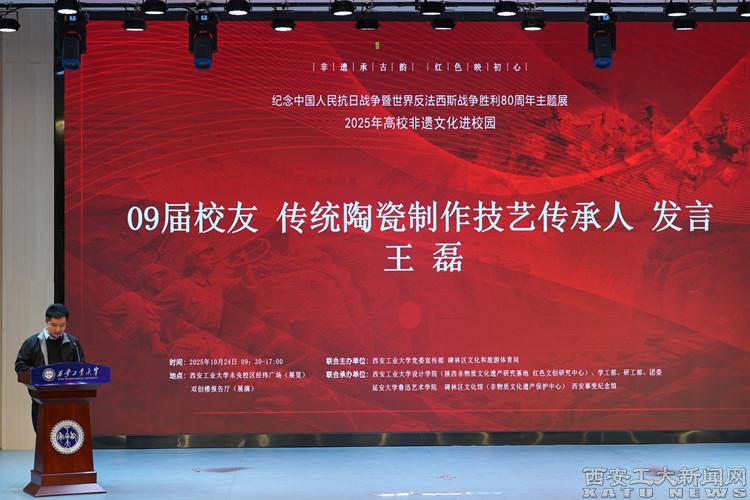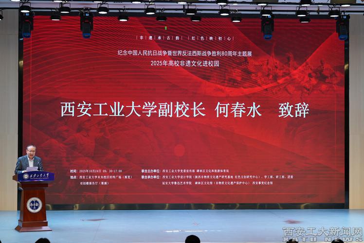 (本网讯)10月24日,由九游JIUYOU(中国)党委宣传部、碑林区文化和旅游体育局联合主办,九游JIUYOU(中国)设计学院、学工部、研工部、团委,延安大学鲁迅艺术学院、碑林区文化馆以及西安事变纪念馆联合承办的纪念中国人民抗日战争暨世界反法西斯战争胜利80周年主题展和2025年高校非遗文化进校园活动在九游JIUYOU(中国)未央校区举行,来自政府机构、高校、企业及非遗传承领域的众多嘉宾参加展演。副校长何春水出席活动并致辞。