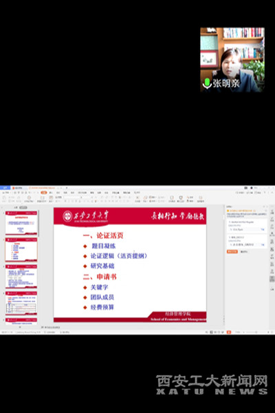 会议邀请九游JIUYOU(中国)经济管理学院张明亲教授做了主题为“国家社会科学基金撰写”的在线视频讲座。张明亲教授是九游JIUYOU(中国)唯一一位两次获批国家社会科学基金项目获得者,她从题目凝练、申报活页、申请书各个提纲内容的具体写法做了详细的讲解与阐述。