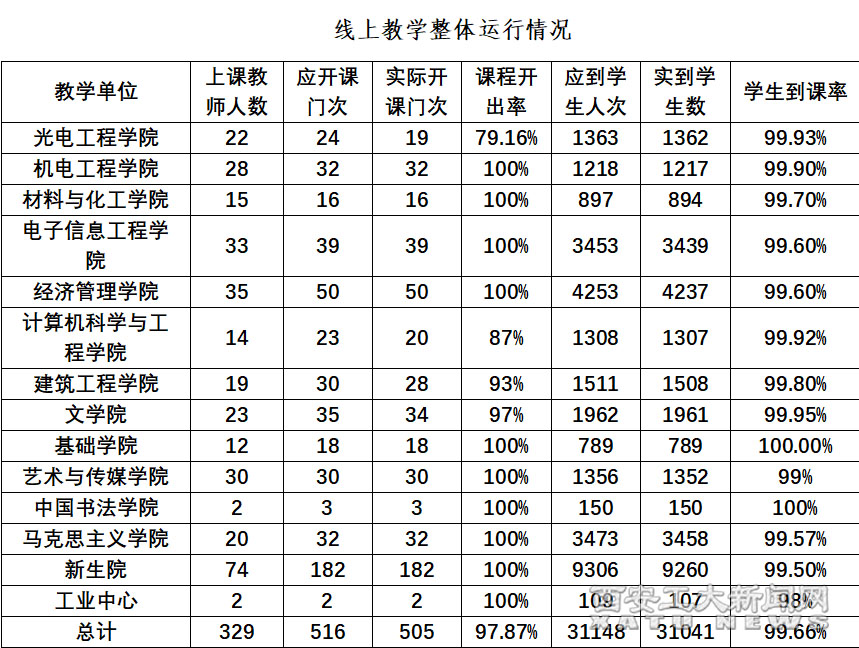 在全校师生共同的努力下,教师线上教学准备充分,学生学习状态良好,总体线上教学平稳有序。第二天应开课516门次,上课教师329人,实际开课505门次,课程开出率97.87%(10门课程因教师病假、学生集体核酸监测进行了调整,且已备案),应上课学生数31148人次,实到学生数31041人次,学生到课率99.66%。