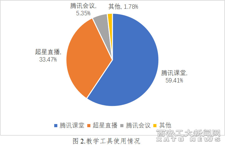 教师在线上教学过程中能够根据自己课程特点,合理使用在线教学平台与直播工具,在线教学工具中使用腾讯课堂300门次、占比59.41%;超星直播169门次,占比33.47%;腾讯会议27门次、占比5.35%;其他9门次,占比1.78%。
