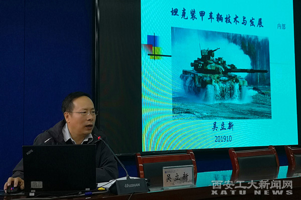 报告会上,吴立新研究员结合自身的实践经验和研究成果,从坦克装甲车辆的过去与现在、功能与组成、炮塔武器系统与发展三个方面向在场师生介绍了我国坦克装甲车辆的现状与未来的发展动向。他表示,坦克装甲装备以及其他作战系统大多会历经信息化、网络化、无人控制化、智能化的发展历程,希望广大师生抓住机遇,迎难而上,为将我国建成军事化强国奉献自己的一份力量。