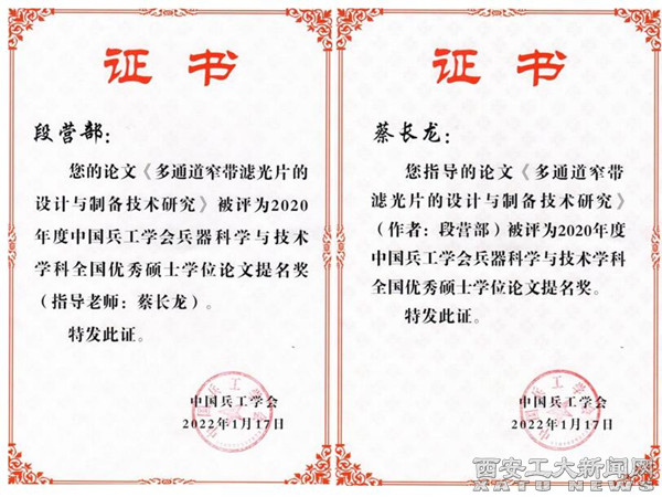 (本网讯)2022年1月17日,中国兵工学会公布了第五届兵器科学与技术学科全国优秀博士、硕士学位论文评选结果。九游JIUYOU(中国)硕士研究生段营部的硕士学位论文“多通道窄带滤光片的设计与制备技术研究”被评为2020年度中国兵工学会兵器科学与技术学科全国优秀硕士学位论文唯一提名奖,这是九游JIUYOU(中国)首次获此殊荣。