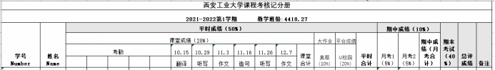 过程性评价成绩=课堂成绩×20%+Fif月考1×5%+Fif月考2×5%+U校园×20%+大作业×10%