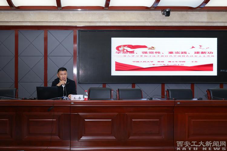 (本网讯)为深刻铭记中国共产党百年奋斗的光辉历程,深刻感悟中国共产党始终不渝为人民的初心宗旨,深入学习贯彻习近平新时代中国特色社会主义思想。11月10日,马克思主义学院、校团委、科学技术研究院邀请中国人民大学马克思主义学院教授王东为师生们开展了题为“学思想、强党性、重实践、建新功”——深入学习贯彻习近平新时代中国特色社会主义思想的专题讲座。本次讲座由校党委委员、副校长陈建主持。现场济济一堂,两百余师生到场聆听,气氛热烈。