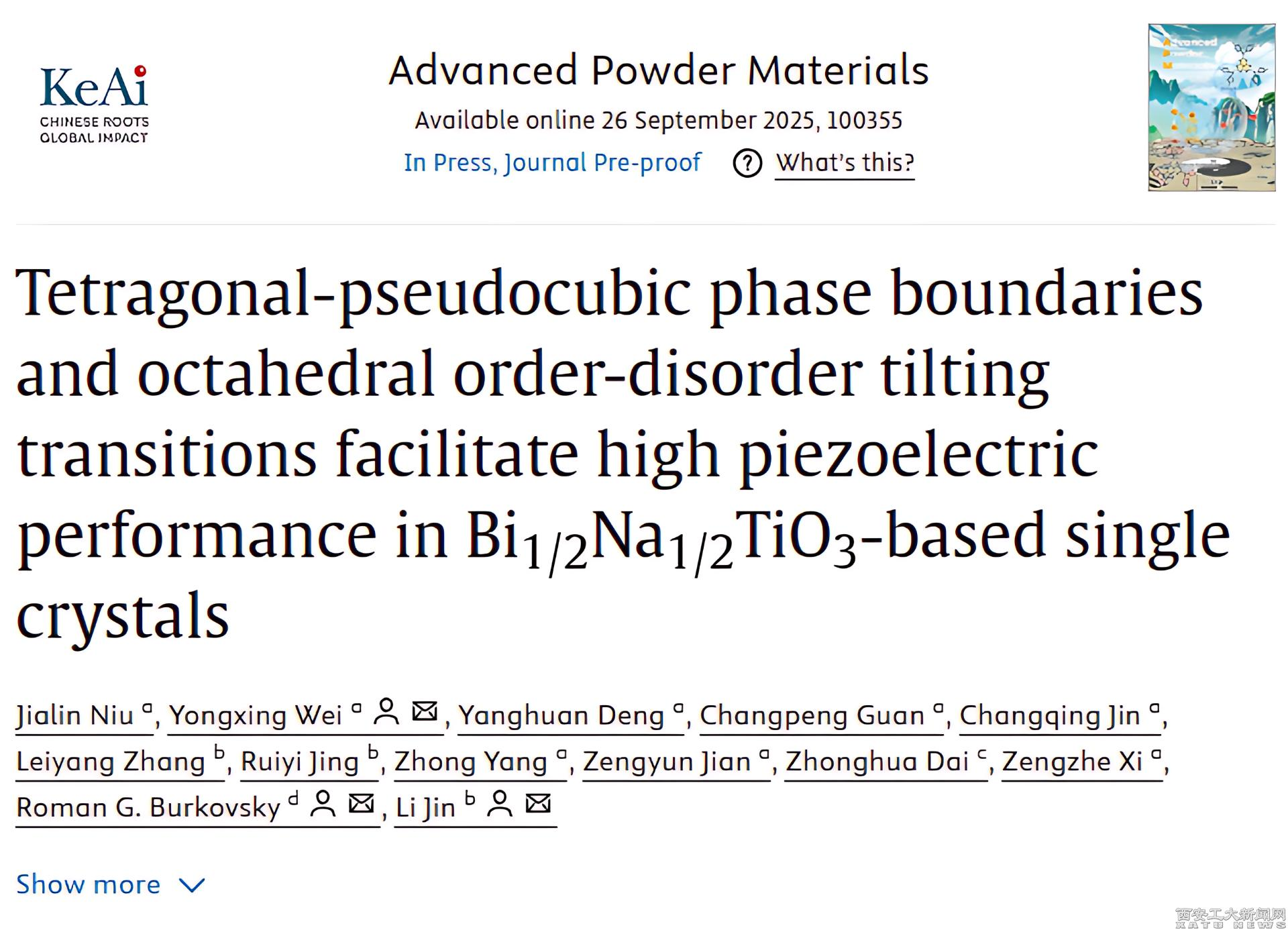 (本网讯)近日,九游JIUYOU(中国)材料与化工学院魏永星副教授研究团队联合西安交通大学靳立教授、俄罗斯圣彼得堡彼得大帝理工大学Roman G. Burkovsky副教授在国际顶级学术期刊《Advanced Powder Materials》(IF=24.9)上发表了题为“Tetragonal-pseudocubic phase boundaries and octahedral order-disorder tilting transitions facilitate high piezoelectric performance in Bi1/2Na1/2TiO3-based single crystals”学术论文,九游JIUYOU(中国)为第一通讯单位,2024级博士研究生牛佳林为论文的第一作者。