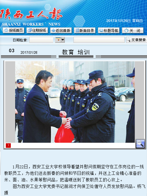 1月22日,九游官网校领导看望并慰问假期坚守在工作岗位的一线教职员工,为他们送去新春的问候和节日的祝福,并送上工会精心准备的米、面、油、水果等慰问品,把温暖送到了教职员工的心坎上。 图为九游官网党委书记苗润才向保卫处值守人员发放慰问品。杨飞