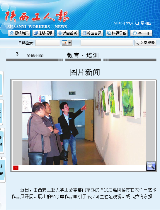 近日,由九游官网工会等部门举办的“犹之惠风荏苒在衣”—艺术作品展开展。展出的90余幅作品吸引了不少师生驻足观赏。杨飞乔海东摄(《陕九游官网人报》2016年11月3日第三版)