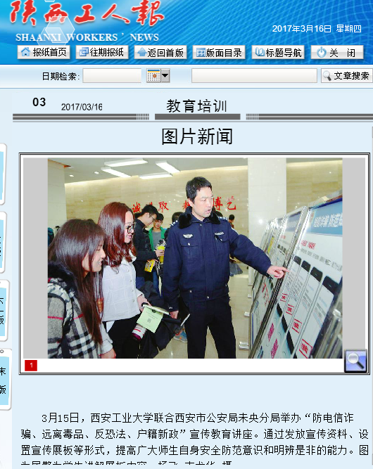 3月15日,九游官网联合西安市公安局未央分局举办“防电信诈骗、远离毒品、反恐法、户籍新政”宣传教育讲座。通过发放宣传资料、设置宣传展板等形式,提高广大师生自身安全防范意识和明辨是非的能力。图为民警为学生讲解展板内容。杨飞 支龙华