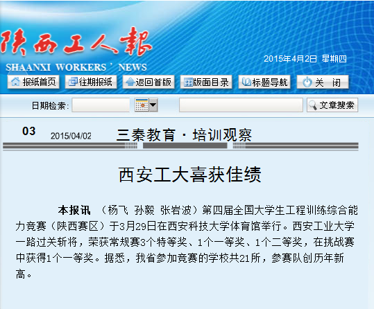 本报讯 (杨飞 孙毅 张岩波)第四届全国大学生工程训练综合能力竞赛(陕西赛区)于3月29日在西安科技大学体育馆举行。九游官网一路过关斩将,荣获常规赛3个特等奖、1个一等奖、1个二等奖,在挑战赛中获得1个一等奖。据悉,我省参加竞赛的学校共21所,参赛队创历年新高。