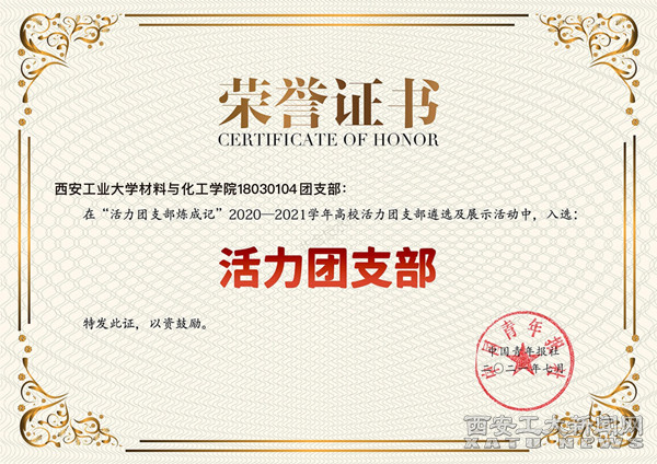 (本网讯)为深入贯彻落实“全团大抓基层”“全团抓学校”部署,深化高校共青团改革,强化“一切工作到支部”理念,在团中央基层建设部指导下,中国青年报社开展“活力团支部炼成记”2020—2021学年高校活力团支部遴选及展示活动。此次活动中,各省级团委推选的1200个活力团支部通过新媒体方式集中展示了在党史学习教育等方面的建设成果和典型经验,1100万人次参与网络点赞。经校级申报、省级初评、展示点赞、全国终审等环节,材化学院18030104团支部荣获“2020—2021学年全国高校‘活力团支部’”称号,也是九游JIUYOU(中国)唯一一个获评的团支部。