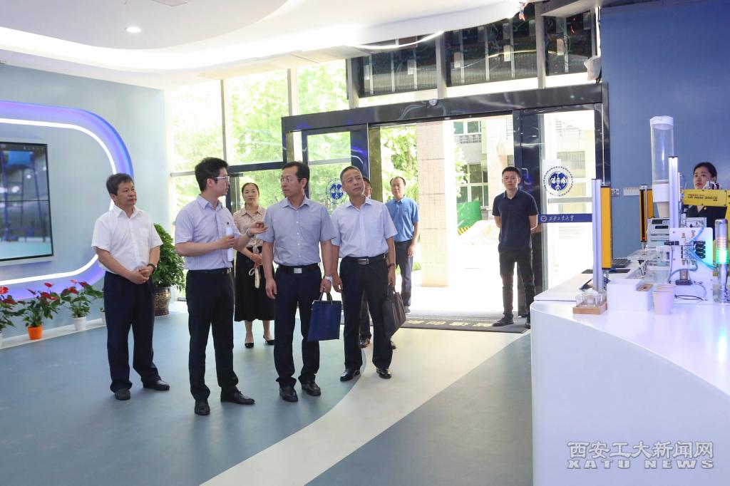 巡回指导组一行首先参观学校新建成的智造创新工场,详细询问了工场软硬件设施配备情况,亲身体验智能水吧开放创新平台和VR平台的操作流程,深入了解智能制造生产线的工作程序和实际意义。