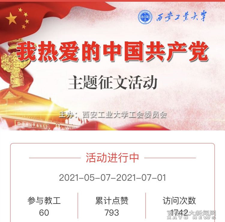 (本网讯)以史明鉴,开创未来,校工会积极引导广大教职工爱党、信党、跟党走。在中国共产党成立100周年之际,工会组织开展了“我热爱的中国共产党”主题征文和“党的知识知多少”有奖竞答活动,近1200人次参加活动。