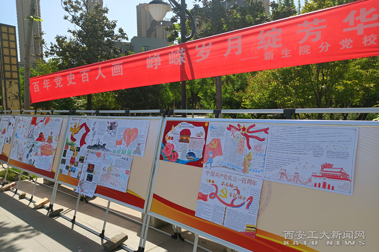 (本网讯)近日,”百年党史百人画,峥嵘岁月绽芳华“党史小报展览活动于博苑广场举行。本次活动由新生院党委主办、忠诚进取社区承办,共展出20余份党史手抄报。