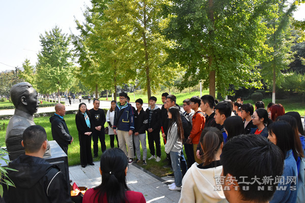 随后,师生一行来到了图书管南侧吴运铎雕像前,向吴运铎雕像献花、鞠躬,深情缅怀他对党的建设事业的丰功伟绩。兼任物理实验室党支部书记的理学院院长张建生现场为党员们上了一节微党课,教导我们新时代党员要继承先辈遗志,践行“把一切献给党”的兵工精神。教师要巩固育人的初心,学生要巩固学习的初心,增强信念,为党的事业贡献自己的力量。