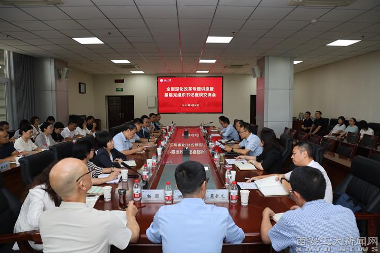 (本网讯)为深入贯彻落实“718”干部大会、全面深化改革方案交流研讨暨下半年工作布置会精神,不断引导各基层党组织聚焦改革任务展现担当作为,9月4日,学校召开全面深化改革专题讲座暨基层党组织书记座谈交流会,邀请西北工业大学航空学院党委书记于辉作专题辅导报告并开展工作交流。校党委书记侯成义,各学院、研究院党委(党总支部)书记、副书记,党办校办、组织部、人事处相关人员参会,会议由校党委副书记马福主持。